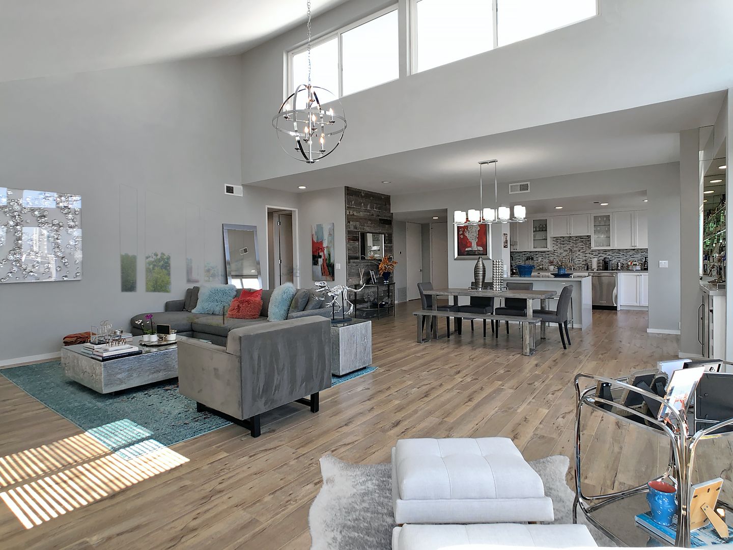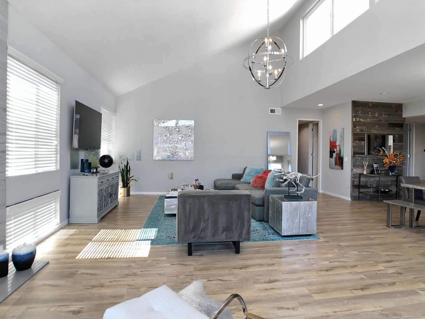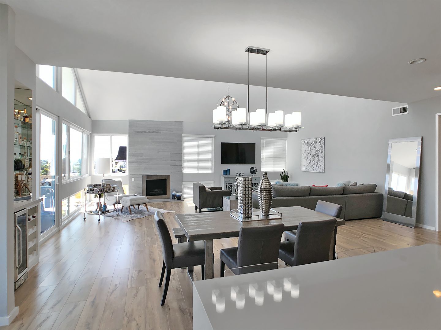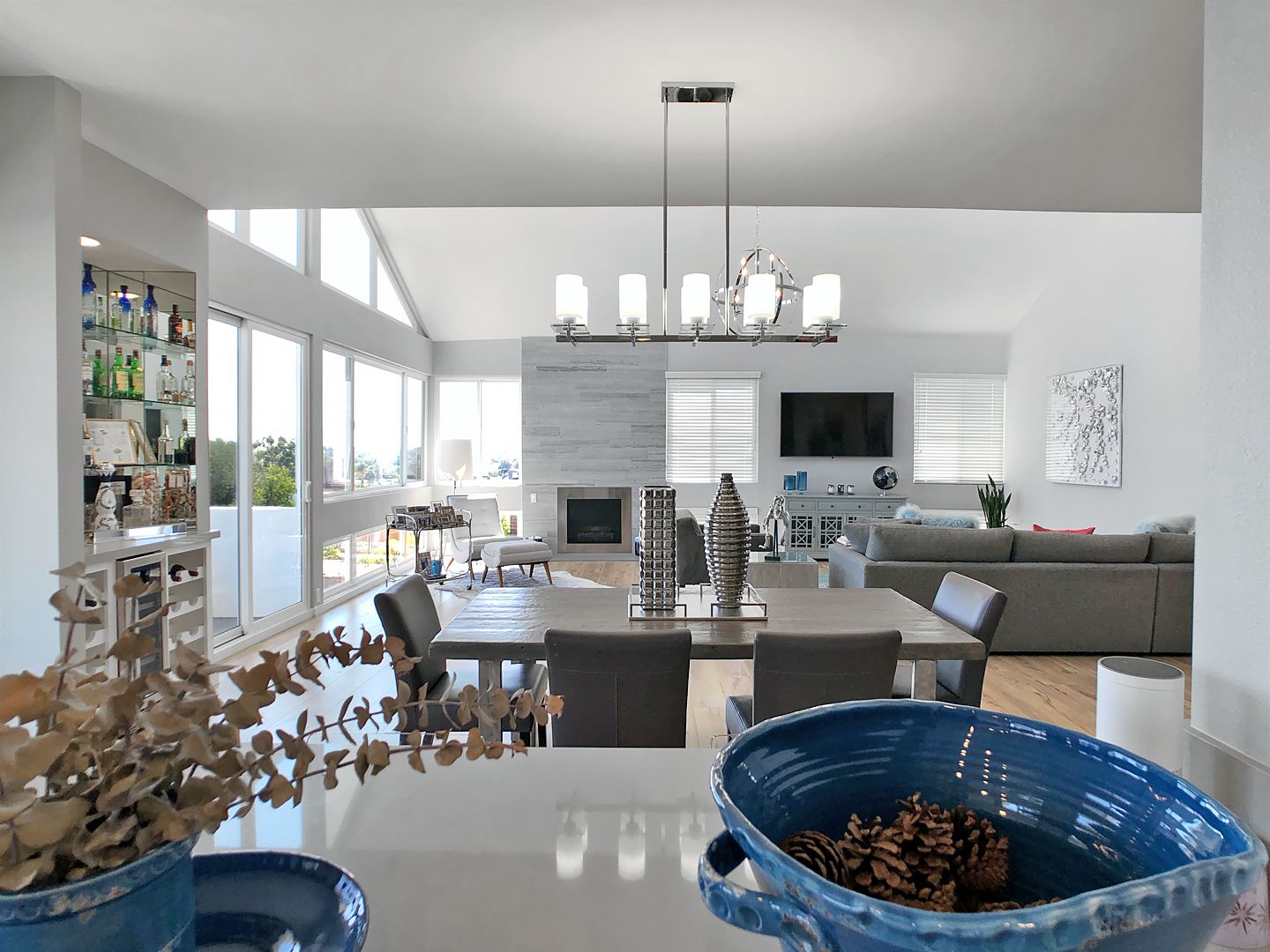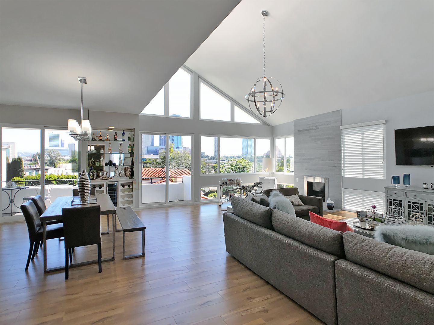 Designed to impress, the residence features soaring vaulted ceilings and expansive windows that flood the space with natural light, creating an open and airy atmosphere throughout.